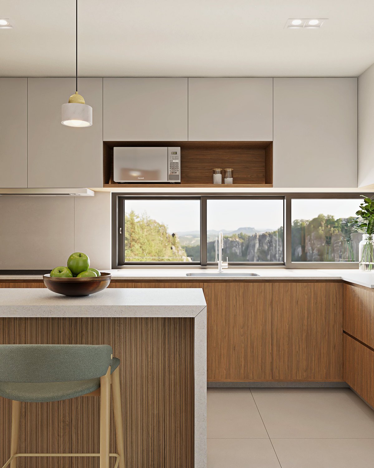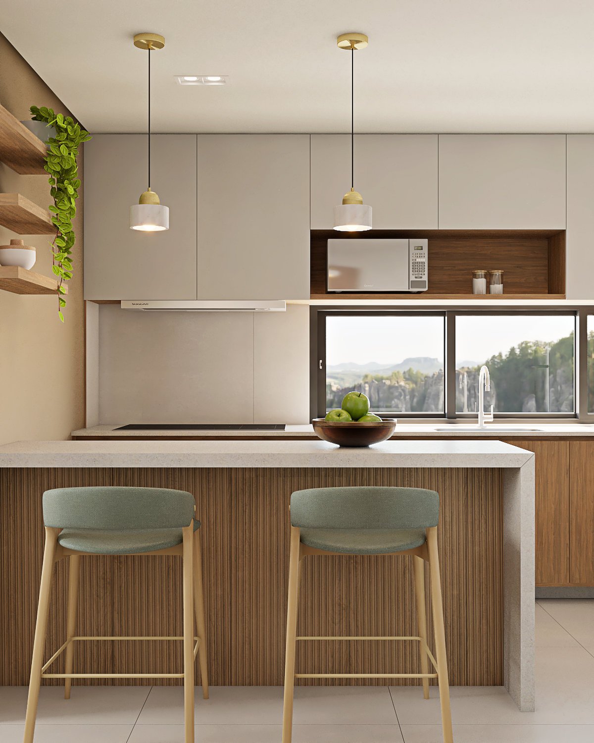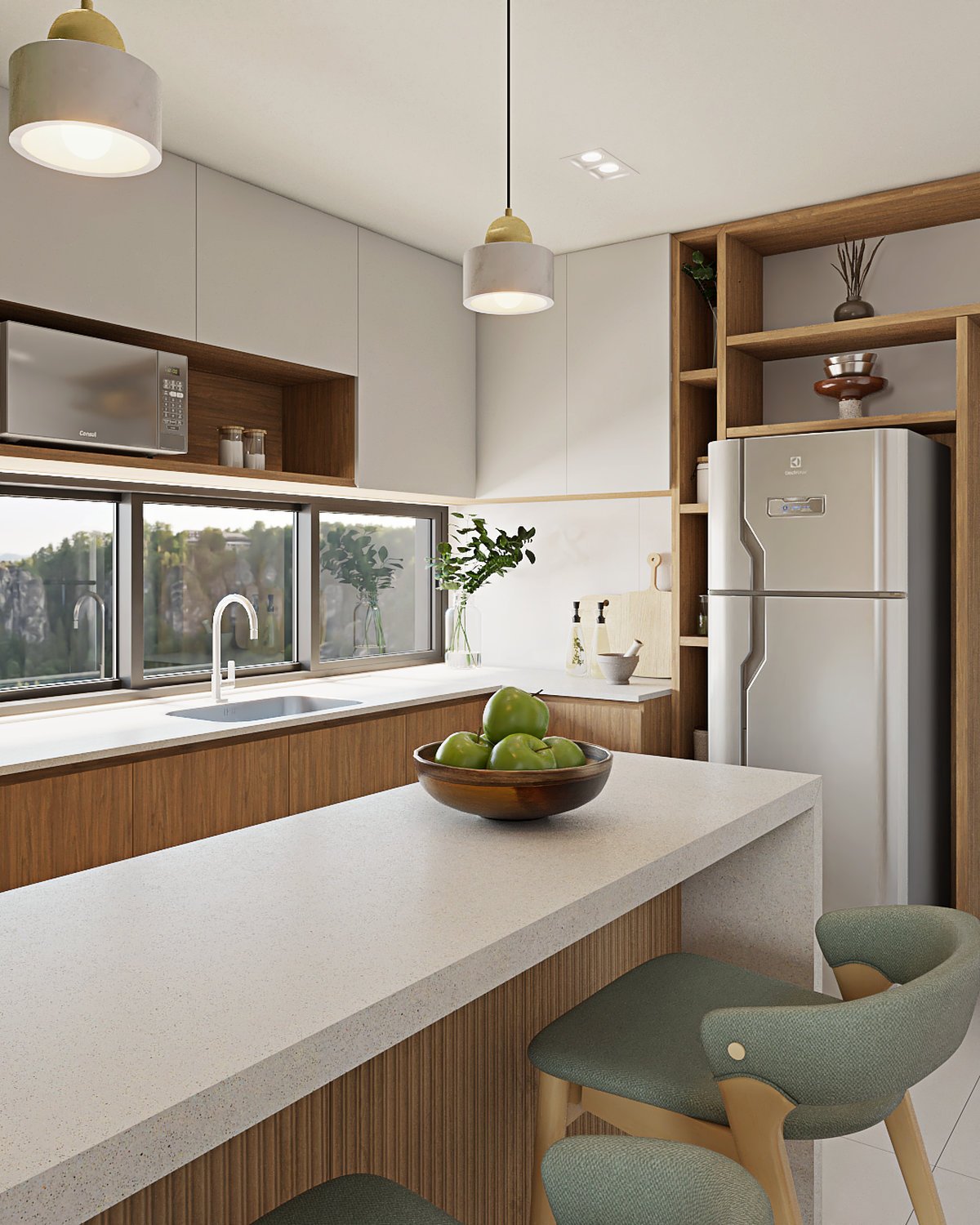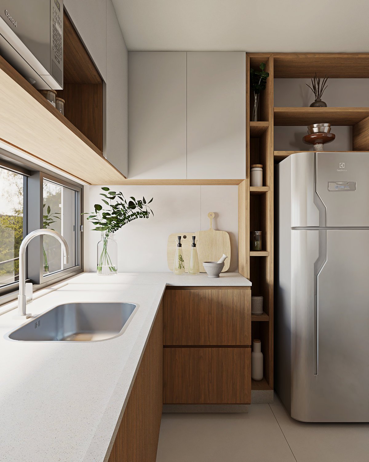 Foi pensado o melhor aproveitamento de espaço para essa cozinha, com armários que permitem bom armazenamento e bastante espaço de trabalho nas bancadas. Por ser pequena, foi escolhida a cor branca como protagonista para revestimentos, bancada e armários superiores compondo com o amadeirado em detalhes na marcenaria e armários inferiores.